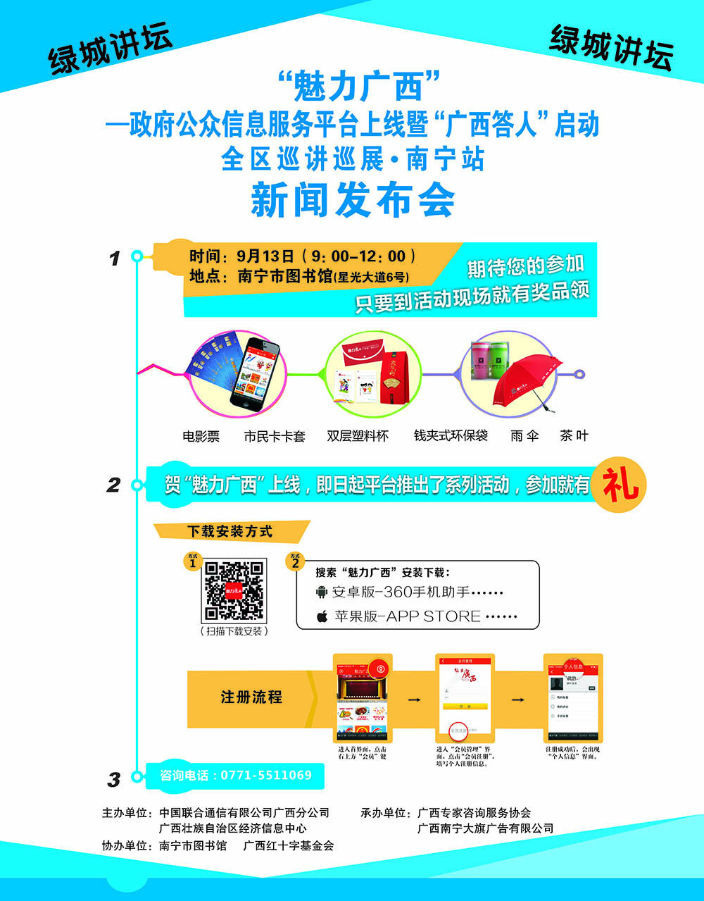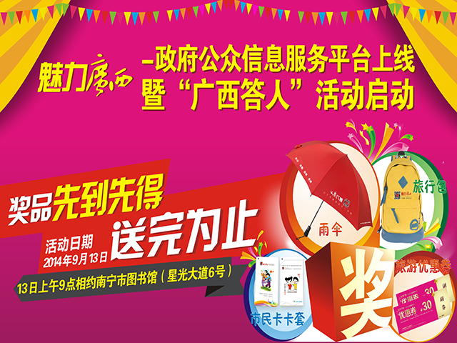 2014年9月13日(星期六上午9:00:~12:00),南宁市图书馆携手广西壮族自治区经济信息中心、中国联合通信有限公司广西分公司、广西专家咨询服务协会、广西南宁大旗广告有限公司和广西红十字基金会联合举办以“创新政务服务•传播广西魅力•共享智慧生活”为主题“魅力广西”——政府公众信息服务平台上线暨“广西答人”活动启动新闻发布会,同时举办“魅力广西”-政府公众信息服务平台全区巡讲巡展•南宁站活动,希望通过新闻发布会的召开,号召各级政府和企事业单位参与到平台建设推广中来,共同将平台打造成为深受欢迎的广西第一移动门户。