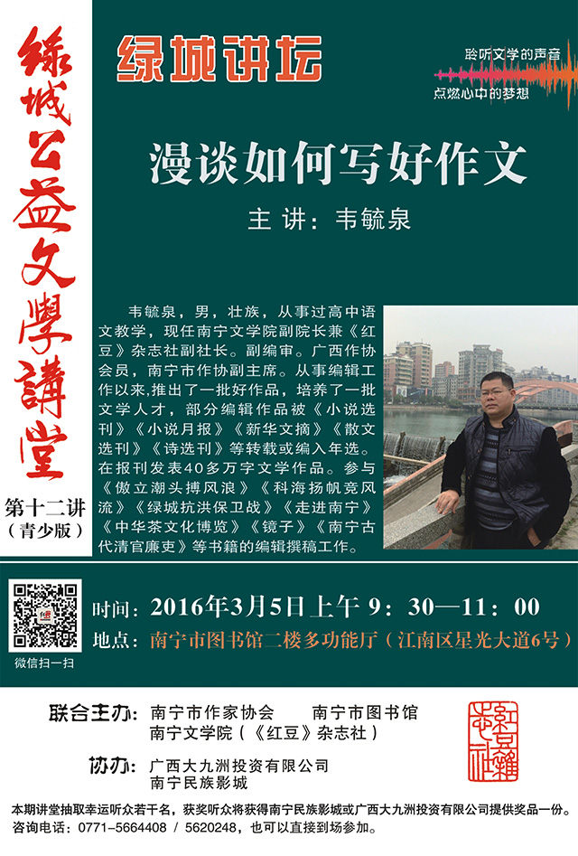 为进一步提升南宁两大讲座品牌——“绿城公益文学讲堂”与“绿城讲坛”的辐射力和影响力,扎实推进南宁市“文化兴市”工作的全面开展,南宁市作家协会、南宁文学院(《红豆》杂志社)与南宁市文化新闻出版广电局、南宁市图书馆倾情合力,本着“文化惠民”的宗旨,于2016年3月起,在南宁市图书馆多功能厅开设“绿城公益文学讲堂”与“绿城讲坛”合作会场,双方将联手共邀广西区内外文学名家做客主讲,为广大市民呈现内容丰富、形式多样的主题讲座。