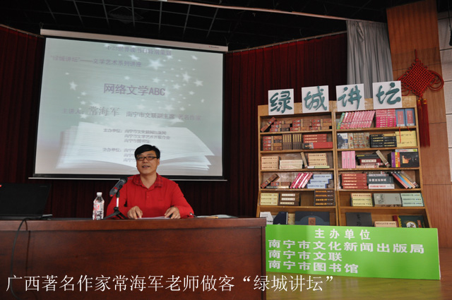 为了进一步发扬绿城人民的文艺热情,推动首府南宁文艺事业的长足发展,4月23日即第16个“世界读书日”当天,由南宁市文化新闻出版局、南宁市文学艺术界联合会和南宁市图书馆主办,江南区宣传部、江南区文明办、江南区团委和江南区图书馆协办,联合邀请到广西著名作家常海军做客“绿城讲坛”,在南宁市图书馆举办了一场生动有益的文化艺术专题公益讲座——“网络文学ABC”;与此同时,“江南读书人”书友会也在这场有意义的讲座开讲之时,正式落户南宁市图书馆,携手为广大读者提供以讲座和座谈会为主的读书活动。