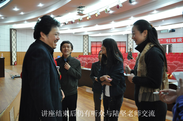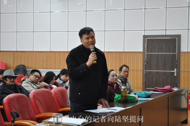 在讲座开始前,到场者首先通过广西电视台摄制的《影响》专栏了解了陆坚和他的创作心路历程,随后,陆坚与大家分享了自己总结的六大创作体会和他创作的歌曲视频,他说,写好主旋律歌曲应遵循三大要素——良好的思想素质、深厚的文化修养和丰富的生活阅历,他强调,一定要拥有美好的心灵和社会责任感,才能创作出好的作品来,经典是最经得起考验的。无论是《世界是一家》,还是《青山绿水都是歌》,无论是高亢抑或抒情的旋律,大家都从陆坚创作的歌词中感受到人间的真善美。到场者表示,通过在生活中听广播和看电视的方式,也都比较熟悉陆坚的这些作品了,零距离听了陆坚的讲座,不但了解了歌词与诗歌的关系,更感受到了做人与作品的深刻内涵,大家决定以感恩的心在生活中唱响时代的主旋律!