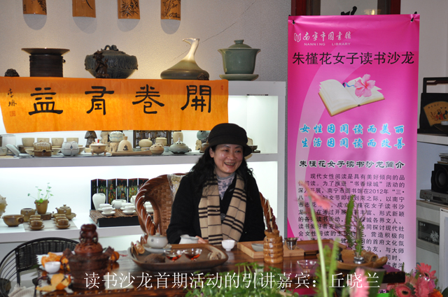 南宁市图书馆朱槿花女子读书沙龙首期活动的主题是文学阅读•读的是人生人世,为大家邀请到的引讲嘉宾是丘晓兰。丘晓兰是《红豆》杂志社主编、副社长,南宁市作家协会副主席,广西作家协会理事,广西散文创作与研究学会秘书长,广西签约作家,南宁市签约作家,南宁文学院客座教授,曾获“南宁市优秀文艺家”、“南宁市优秀作家”、“绿城文化名人”、“南宁市德艺双馨文艺家”称号,至今发表诗歌、散文、小说、评论等百余万字,并多次获得各种奖项,她的作品被多次被转载或收入各选本,出版有散文集《完美的一天》、《幸福是一种简单》,推介南宁民间表演艺术的新书《乡韵土风》也即将出版。丘晓兰还曾创意并责编、联系出版《〈红豆〉诗歌部落作品精选》;参与长篇报告文学《大风起兮云飞扬》第3章约2万字的撰写;参与大型志书《南宁风物志》第4章约6万字的撰写;参与报告文学集《从北部湾驶向世界》第一章约2万字的撰写;在《南宁晚报》、《读城》专栏发表反映南宁市历史文化、风土民情的系列散文30余篇,组织过“《红豆》全国精短散文大赛”等多项文学活动。