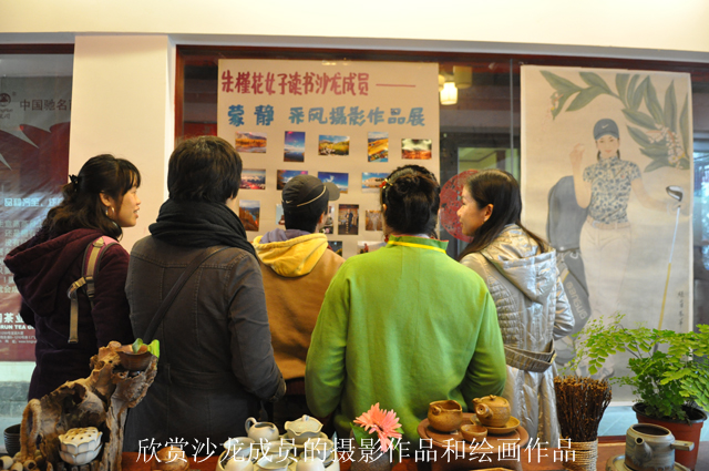 活动开场,沙龙成员们进行了一场雅人深致的成立仪式。大家首先欣赏了沙龙成员零雅婷带来的人物工笔画和蒙静在旅游过程中“猎”回的采风摄影展,本来有位成员李琳也计划现场挥毫泼墨,但因工作关系无法到场,所以她写好一幅“开卷有益”提前送到了沙龙。继而,大家又将关注的目光从书画影像间拉进了沙龙成员梁知《渔舟唱晚》那行云流水般的筝乐声里,沙龙成员覃玲同时为大家进行了花道和茶道表演,此次活动的场地也是由身为资深茶艺师的覃玲友情提供的。来自各行各业的沙龙成员都在成立仪式上施展才艺,无不为沙龙的成立活动增姿添彩!