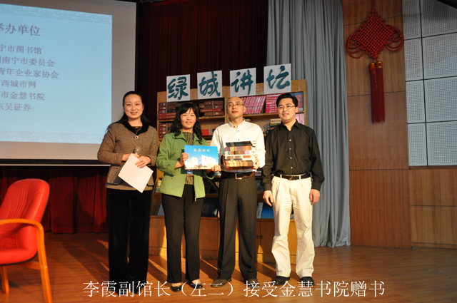 在讲座开始之前的赠书仪式上,南宁市金慧书院和东吴证券为南宁市图书馆送上了《慢一点》、《调频道》等14套84册图书,南宁市图书馆接受的这批赠将被及时著录尽快与读者见面,共青团南宁市委也接受了10套60册赠书。