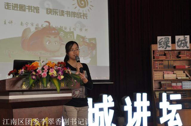 该讲座由南宁市图书馆活动部副主任黄珂主讲,自去年起为前来参观图书馆的南宁市五中、南宁市金太阳教育学校分别举行了两场,已成为“绿城书香•相约邕图”系列公益讲座的品牌之一。黄珂系南宁市文艺理论家协会会员、南宁市作家协会会员,中国图书馆学会会员、广西图书馆学会会员和南宁市图书馆学会会员。1990年开始发表作品,先后发表在《中国文化报》、《新乡日报》、《新乡晚报》、《南宁日报》、《南宁晚报》、《南国早报》和《当代生活报》,1993年在台湾《中国家庭教育》杂志发表的诗歌《归心》在当时引起了一定的社会反响。在媒体上撰写、发表诗歌、散文以及新闻等300多篇,现主要从事公共图书馆读者活动策划工作。