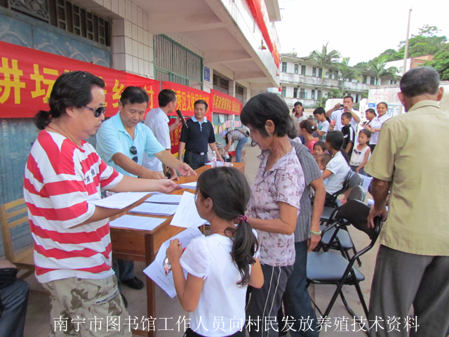 当前,正是夏收夏种的农忙季节,南宁市图书馆充分发挥教育职能,联合多家区、县图书馆将“政策宣传暨农技下乡”主题活动当作一项重要工作来抓,坚持文化下乡人人享、农技知识村村有,真正帮助农民增收致富。6月份以来,这一系列活动已先后在青秀区、隆安县等三个乡镇举办,收到了良好的成效。