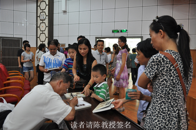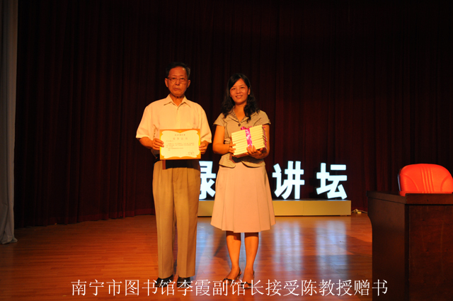 在讲座开始前,陈家骥教授为南宁市图书馆赠送了10册《我心怀念清华》,他的这本著作叙述的是自己成长和奋斗的历程,全书自始至终充满了亲情、友情、师生情、同窗情、乡土情和爱国情,打动了不少家长和孩子的心,李霞副馆长接受了赠书,并表示一定尽快著录这些极具教育