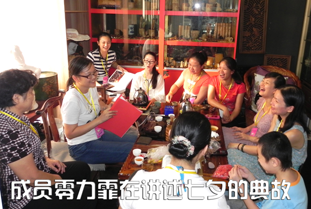 “Today,We will talk a story about The Double Seventh Festival, on the 7th day of the 7th lunar month, is a traditional festival full of romance……”身为英语教师的成员零力霏用英文这样一种特殊的表达方式向大家讲述了七夕节的典故,使大家在祥和快乐的气氛中进一步加深了对该传统节日的了解。在我国,农历七月初七,人们俗称“七夕节”,也有人称之为“乞巧节”或“女儿节”,这是中国传统节日中最具浪漫色彩的一个节日,随着西方“情人节”流入中土,“七夕节”逐渐又被人称为中国的“情人节”。七夕节始终和牛郎织女的传说相连,这是一个美丽浪漫、千古流传的爱情故事,是我国四大民间爱情传说之一。 成员覃玲还为大家解读了“两厢情愿”一词的由来,她说,以前苏州人家生了女儿就在门前种一棵樟树,待到女儿长成后,便做成两只樟木箱做为陪嫁之物,意味两厢情愿。成员零雅婷也提出了她的观点:在爱情或婚姻中,女性最好不要太依赖对方,无论双方感情多好,独立的、善于处理情感需求的现代女性才更有魅力,爱情才更持久! 在交流了古今中外的爱情故事之后,大家还一起在成员梁知和王永红的悠悠箫声中,诵读了唐宋大家杜牧、秦观、李清照的诗词《鹊桥仙》、《辛未七夕》和《行香子》等,“柔情似水/佳期如梦/忍顾鹊桥归路/两情若是久长时/又岂在朝朝暮暮”、“星桥鹊驾/经年才见/想离情/别恨难穷/牵牛织女/莫是离中/甚霎儿晴/醍儿雨/醍儿风”、“今日云骈渡鹊桥/应非脉脉与迢迢/家人竟喜开妆镜/月下穿针拜九宵”,这些优美的词句风格浑成、意蕴深沉,通过成员们抑扬顿挫地演绎更加充满诗情画意。