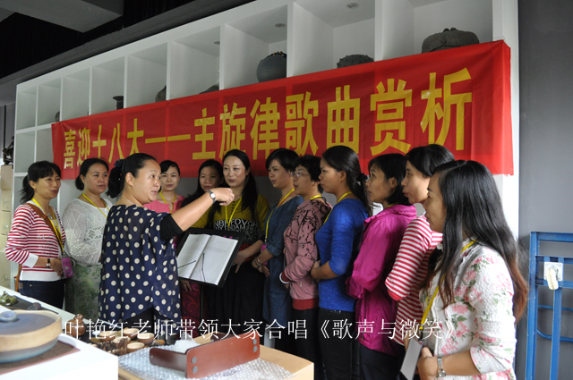 该活动邀请叶艳红主讲,叶艳红系中国儿童音乐学会会员,“中国小音乐家评选活动•全国组委会”副秘书长兼理事,广西音乐家协会合唱联盟会员、小海螺童声合唱团团长。自1994年至今,叶老师曾录制《北部湾的孩子》CD专辑和《小娃崽的歌》个人教学专辑等,她在全国及区、市级演唱表演类大赛中多次荣获指导老师奖。在赏析讲座中,叶艳红老师首先为沙龙成员介绍了《歌颂祖国》、《爱我中华》和《没有共产党就没有新中国》等多首经典的、健康向上的爱国歌曲,她说,唱歌是一件非常有益于身心的事情,尤其是在党的十八大即将召开之际,大家一起学唱主旋律的爱国歌曲,不仅进一步增强了爱国心,更增强了大家的使命感。叶老师重点强调了如何理解和诠释并唱好主旋律歌曲,她还以科学、风趣的教唱作风,引导沙龙成员们进行练声,她让大家一口气反复几遍从1数到10练习气息,在“哦……”、“绿绿绿”、“布谷——”的和声中,大家很快就找到了感觉。叶老师还支招,她建议大家在日常生活中注意保护嗓子,养好气息,如卷舌顶腭生津利咽,用腹部“说话”调好生息等。最后,和着叶老师的精心指导和声声鼓励与窗外小雨的淅淅沥沥,大家合唱一曲轻快动听的《歌声与微笑》为活动添上了一个美妙的休止符。