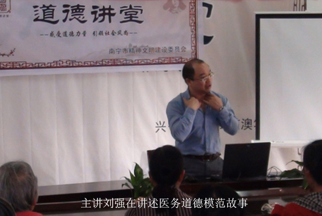 讲堂上,大家首先高歌了《学习雷锋好榜样》这首经典歌曲,继而观看了《全国道德模范:索道医生邓钱堆》先进事迹视频专题短片,广西壮族自治区人民医院康复中心副主任刘强医师应邀在现场主讲,他说,作为一名医务工作者,首先要有“医者仁心”,要把为病人服务、解除病人疾苦作为自己最大的快乐,尽职尽责,真正意义上成为病人心目中的好大夫、好医生和同行们学习的好榜样,他讲述了白求恩大夫的故事,还和大家分享了刘玉莲、谭峥等当代医务道德模范的先进故事。同时,他还为社区居民送上冬季养生知识,强调了做好保健、乐于奉献的辅成关系。社区居民们有感而发,纷纷表示受益匪浅。在“诵经典”环节中,大家齐声诵读了《道德三字经》,并共同许下了“道德承诺”,深深铭记“存好心、做好事、当好人、有好报”这段道德格言。最后,在主持人“健康平安合家欢”的祝福声中,大家得到了一份印有“道德讲堂”标识的纪念品。