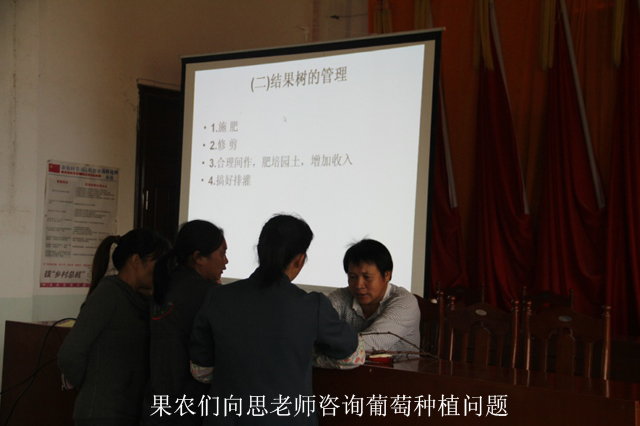 前来听课的有明亮镇9个自然村和一个社区的葡萄种植户近百名,思老师分别从葡萄生产的特点和发展趋势、葡萄的栽培管理技术、葡萄的采收、分级与包装、葡萄病虫害防治等几个方面进行讲解,特别针对讲课之前在上林县图书馆领导的陪同下到生态葡萄种植基地查看葡萄的种植与管理情况:有的葡萄藤出现枯萎,有的存在整形修剪不合理等问题进行了详细的解答。果农们有的拿着照相机拍下了思老师的全部课件,有的在认真的做笔记,整个会场一片安静,果农们都有一种恨不得要把思老师的葡萄种植技术全部带回家的感觉。课后,有的种植户还围着思老师请教自已在种植葡萄中存在的问题并留下了思老师的电话以便日后咨询。