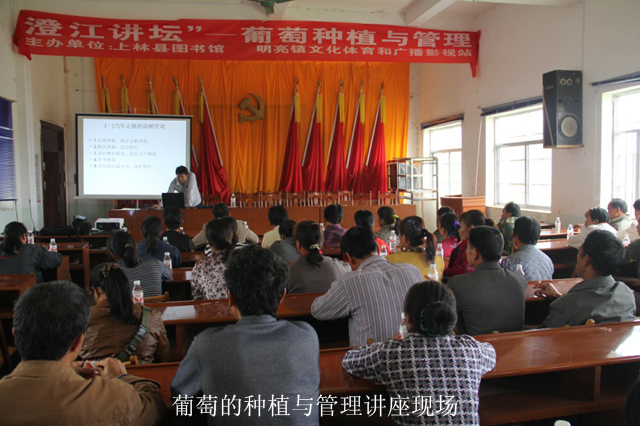 上林县明亮镇通过推进葡萄集约化经营,目前在甘六村、罗勘村发展起2000亩的生态葡萄种植基地。然而由于明亮镇的果农们种植葡萄的时间还不是很长,在种植与管理上经验还不够丰富,为了提高果农们的种植与管理水平,让他们来年有更好的收成,2012年11月5日,在南宁市文化新闻出版局、上林县文化广播影视和体育局、明亮镇人民政府的大力支持下,南宁市图书馆携“绿城讲坛”走进上林县明亮镇政府大礼堂与上林县图书馆、明亮镇文化体育和广播影视站联合主办了“葡萄的种植与管理讲座”。