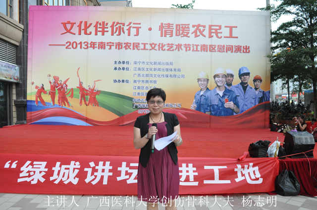 南宁市图书馆带着“绿城讲坛”走进工地,邀请了广西医科大附属第一医院骨创伤专科医生杨志明主讲,针对农民工长期露天和高空作业的特点,就骨创伤预防和紧急救治等内容为农民工朋友详细讲解了自我安全防护等医疗常识,同时还教大家利用生活中最常见的绳子、书本杂志、布块等材料进行急救包扎,使农民工朋友受益匪浅。在保利城工地,现场除了农民工朋友还聚集了大批附近的居民,杨大夫也针对老人和小孩常见的安全危机做了详解,指导大家正确运用急救方法,及时就医,为伤者争取更大的治愈几率。