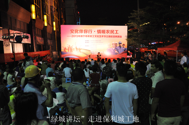 2013年5月21日、22日,在南宁市文化新闻出版局的领导下,南宁市图书馆与江南区文化新闻出版局、江南区总工会、江南区图书馆联合中建五局广西分公司、广西保利置业集团有限公司共同举办2013年南宁市农民工文化艺术节江南区慰问活动,连续两晚走进华南城、保利城工地,为农民工朋友送上“文化大餐”。