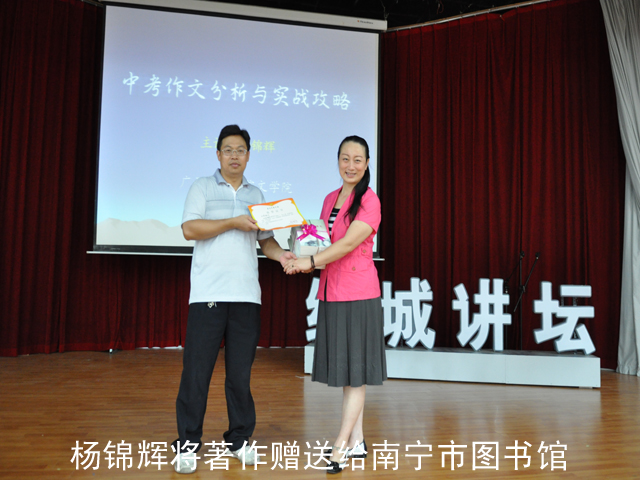 讲座开始前,杨锦辉赠予南宁市图书馆10册自己的著作《跟着作家写作文》,该书提倡“立志须高,入门须正”,堪称指导写作的良师和作文教学的益友。
