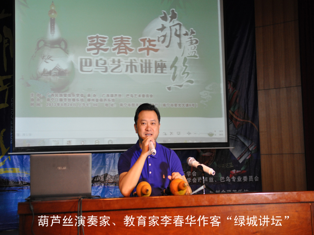 次日上午,南宁市图书馆“绿城讲坛”还力邀李春华作客,为绿城葫芦丝爱好者举办了一场葫芦丝、巴乌艺术讲座。李春华,国家一级演奏员、中国民族管弦乐学会理事、中国民族管弦乐学会葫芦丝巴乌专业委员会副会长,至今从事葫芦丝艺术事业20余载。他师从傣族葫芦丝艺术家哏德全研习葫芦丝艺术,师从著名作曲家陈勇教授学习理论作曲,编著了《葫芦丝巴乌实用教程》等二十余部出版物,创作发表了《打跳欢歌》等近二十首葫芦丝独奏作品。