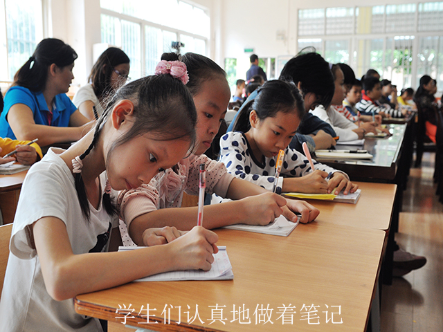 黄珂老师在课件中增添了适用于荷城小学的新内容,她的读书经历、读书目的、好书推荐以及学会感恩等方面都激发了师生们聆听的极大兴趣,不仅积极参与互动问答,而且包括老师在内的每个人都认真地做了笔记。在列举名人关于读书的锦句时,黄珂还引领师生们集体诵读,这也印证了她在课中所讲“好脑子不如烂笔头”、“剪报、摘抄和朗读都是好的阅读习惯”等理念。此外,她通过自己以及同为小学生的儿子的阅读经历向大家推介了中国四大名著、《长袜子皮皮》、《神奇校车》和《世界上最脏最脏的科学书》等十多部中外优秀读物,并建议贵港市图书馆购置此类图书,也推荐孩子们和家长一起到图书馆借阅。虽然提倡大家多读书、读好书,但黄珂老师也提醒孩子们“爱读书是好事,保护视力是大事”,她还希望同学们不仅要以感恩的心读书,还要以感恩的心为人处世,并且提议同学们向现场的老师们道声感谢。主持讲座活动的校方领导叮嘱孩子们回去后要复习今天的听课笔记,并从此开始每天摘抄一句名人锦句以此鞭策自己不断阅读、不断进步。讲座结束后,可爱的荷城孩子们踊跃地排起了长龙要求与黄珂老师签名合影。