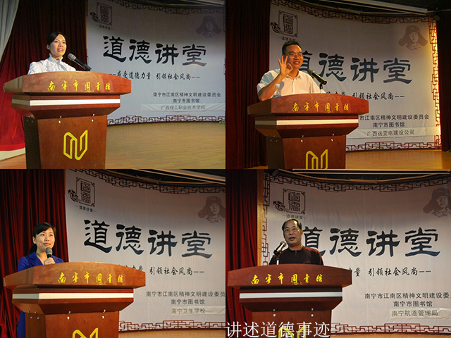 2013年下半年,南宁市图书馆与江南区精神文明办携手合作,把江南区“道德讲堂”总堂设在了南宁市图书馆多功能厅,16个企事业单位、学校、社区将在这里举行“道德讲堂”活动,以传递道德的力量,弘扬社会良好风尚。10月份,广西送变电建设公司、广西理工职业技术学校、南宁市卫生学校、南宁市航道管理局共四家单位和学校在总堂举办了“道德讲堂”活动。