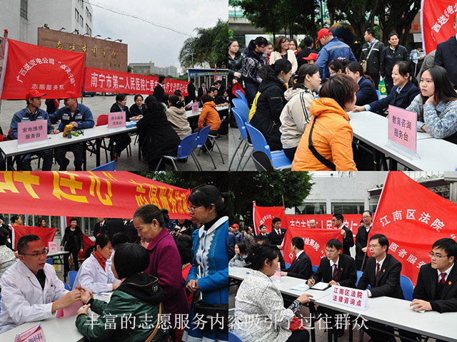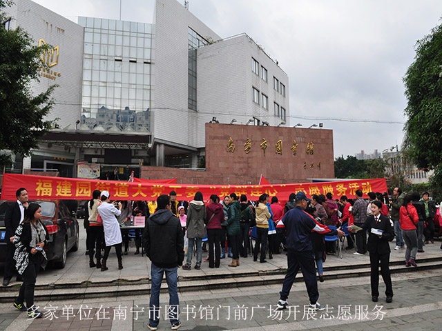 11月27日的“道德讲堂”结束后,在福建园街道大党工委的组织下,其六家委员成员单位组成了志愿服务队在南宁市图书馆门前广场举行了“党群连心”志愿服务活动。南宁市第二人民医院、江南区法院、江南区检察院、广西送变电集团、绿城水务集团分别为过往市民进行了义诊、法律咨询、家电维修、供水服务咨询、教育咨询、“美丽南宁”宣传等志愿服务,受到市民交口称赞。