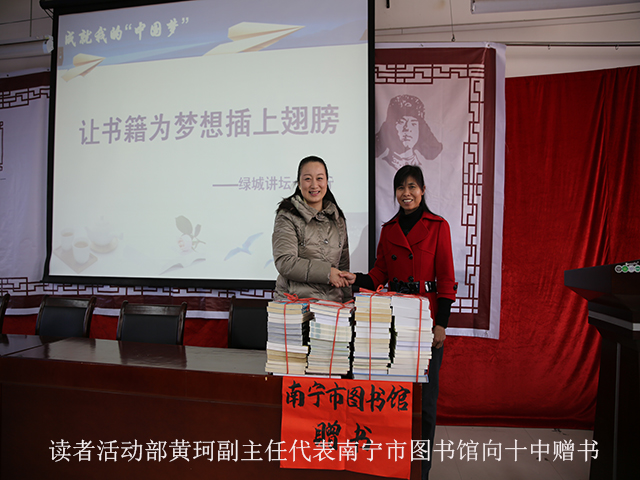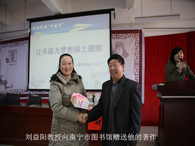 讲座开始前,在洋溢着阳光与活力的《十八岁的梦》这首背景歌曲中,刘益阳教授为南宁市图书馆赠送了他的专著《同工会干部谈逻辑》,南宁市图书馆同时为南宁市第十中学赠送了《庄子选译》《莎士比亚戏剧》《上上下下》等近百册图书,受到了广大师生的一致欢迎。