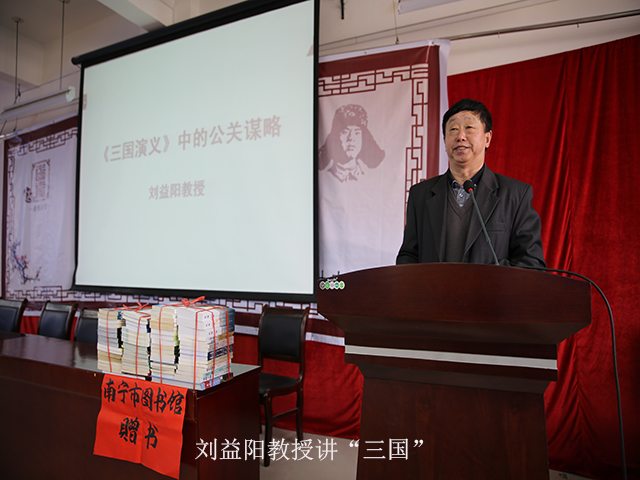 在南宁市第十中学的大礼堂里,刘益阳教授声情并茂,对《三国演义》中的人物如数家珍,并将他们的公关谋略一一剖析,如曹操的公关谋略是胆识过人——乱世之奸雄与一箭三雕——温酒斩华雄;刘备的公关谋略是三顾茅庐——最妙一步棋与天下英雄——惟使君与操;孙权的公关谋略是实用主义——利益永至上与厚黑相兼——用人有绝招等,他还和师生们进行互动,提问一些书中典故,十中的孩子们同样也体现了他们阅读名著的日常积累,对刘教授提出的问题对答如流,如诸葛亮有一句讲做人道理的名言是什么?孩子们很快答出:勿以恶小而为之,勿以善小而不为。刘教授建议同学们果把这句话置之座右,奉为处世箴言,必然会增益良多,长进良多!当讲到范蠡临逃走时写了一封信给越王国的宰相文种时,问大家谁记得信上说什么,有学生立即举手:狡兔死、走狗烹;飞鸟尽、良弓藏;敌国破、谋臣亡……同学们的精彩回答引起场上阵阵掌声,刘教授还为每位答题的学生送上了一份精美别致的小书签作为鼓励。