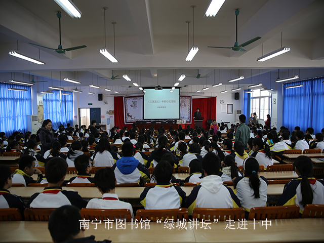12月24日下午,南宁市图书馆“绿城讲坛”走进南宁市第十中学,为师生们举办了一场别具一格的文学经典专题讲座——论《三国演义》中的公关谋略,引起近500位师生的极大兴趣。