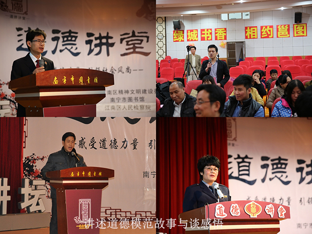 随着“道德讲堂”的深入开展,南宁市掀起了一股学模范、讲道德的良好风气,江南区在连续三个月举办了十几场道德讲堂的基础上,12月份再添三场精彩内容——由江南区地税局、江南区人民检察院和江南区公路管理局分别承办,于南宁市图书馆江南区“道德讲堂”总堂开讲。
