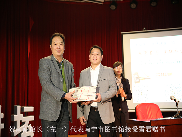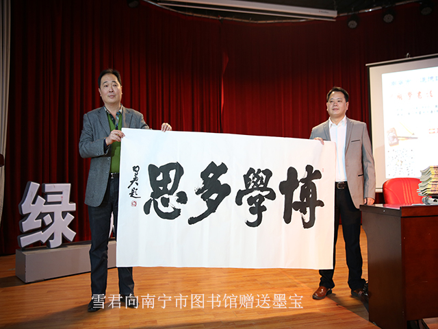 该活动由南宁市图书馆与雪君书道、南宁市天骄教育、广西金太阳教育联合举办。活动当天,南宁市图书馆贺南潮馆长接受了雪君先生向南宁市图书馆赠送的墨宝“博学多思”以及一套“雪君体” 国学经典雪君体赏读本系列书籍,丰富了南宁市图书馆的馆藏。