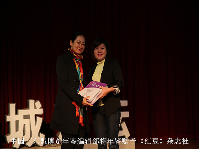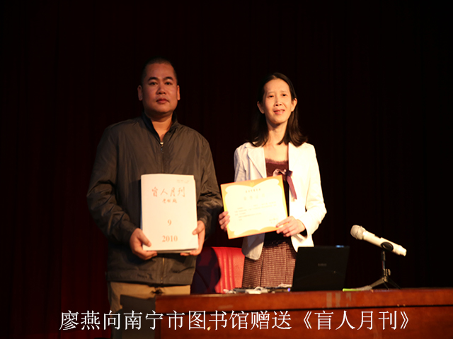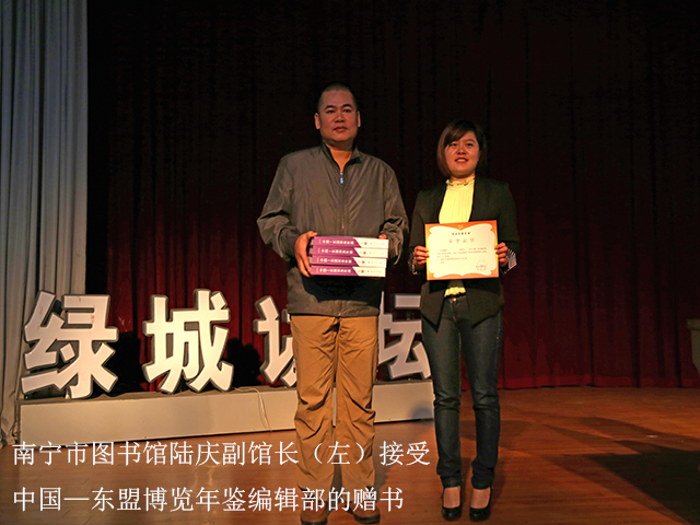 在讲座开始前,中国——东盟博览年鉴编辑部的卢艳英也赶到了“绿城讲坛”的讲座现场,为南宁市图书馆和《红豆》杂志社以及绿城玫瑰作家群赠送《中国——东盟商务年鉴》一书共4024册,该书作为地方文献具有极高的查考价值。除留下以上各单位所需册数外,南宁市图书馆还将把其余副本送到南宁市6县6城区的图书馆收藏。与此同时,廖燕也为南宁市图书馆赠送了《盲人月刊》,陆庆副馆长接受了赠书。这两册刊物将在南宁市图书馆残疾人阅览室上架并永久收藏。