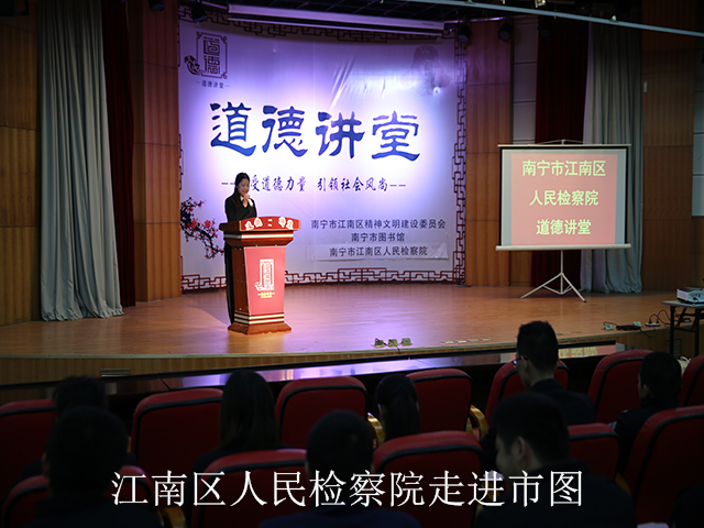 12月18日,南宁市江南区检察院在南宁市图书馆举办以“勇于担当 恪尽职守”为主题的道德讲堂活动,通过开展“自我反省、唱歌曲、学模范、诵经典、谈感悟、送吉祥”等六个流程的活动,让干警们接受了一次心灵的洗礼。江南检察院全体检察人员参加了活动。