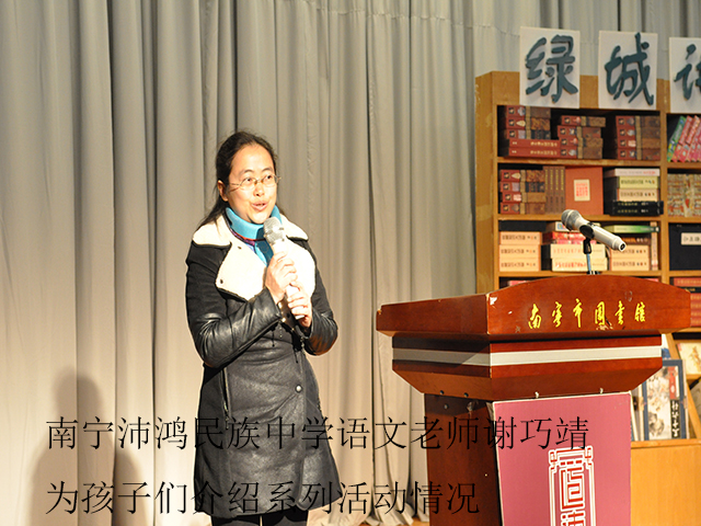寒假伊始,为了丰富同学们的假期生活,提高大家的阅读能力和理解能力,南宁市图书馆和南宁沛鸿民族中学通过日常调查,针对未成年人的学习特点,精心策划了一系列公益文化活动,“阅读兴趣与朗读技巧”文化专题公益讲座正是“美丽南宁•快乐假期”系列活动的启程。在寒假里,“认识图书馆”——了解图书馆的社会功能及学习图书借阅流程读书主题活动将热忱欢迎广大小读者加入其中;在经典名著分享活动一环也为孩子们精心策划了四个部分的内容——朗诵《繁星春水》一书中自己最喜欢的三首小诗并做简单赏析评价;选讲《伊索寓言》一书中一个对自己最有启发的故事,谈谈《西游记》一书中自己所理解的师徒四人的人物特点,而且孩子们还可以在活动中互相荐读一本好书等等;元宵节前还专门准备了一场传统知识有奖猜谜活动,以答题拿奖的方式深化孩子们对传统文化的进一步了解。