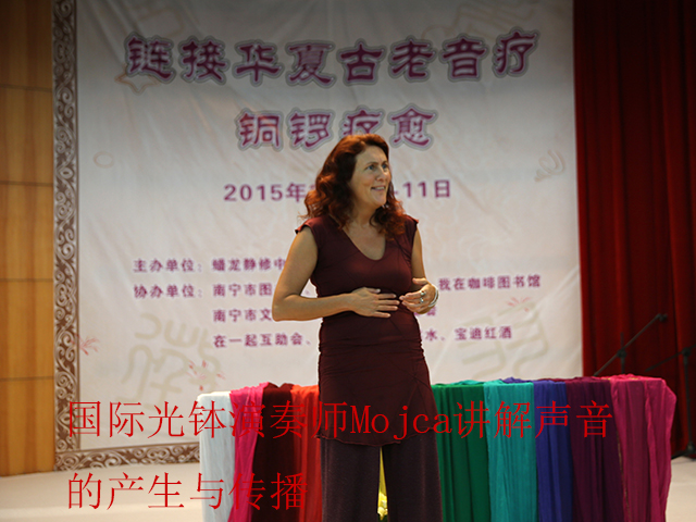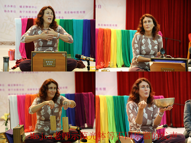 在3月11日的3场讲座中,受邀做客“绿城讲坛”的国际光钵演奏师Mojca Malek同样为广大市民精彩演绎了光钵这种特殊的乐器带给人们的心灵震撼。她精通人体经络学,这与中国的中医学是一脉相通的,她是欧洲知名的铜锣音乐大师; 早在20多年前,她就开始遍访世界文明发祥地,寻求并学习神圣的声音特性学(产生与传播);师从于Don Conreaux为师学习铜锣音乐后,她开始和Don大师一起参加演出,并协助铜锣音乐普及、神圣声音工作坊等。在讲座中,她以自己开创的经络声音——敲颂光钵进行身心按摩,即从身体不同的能量层面帮助人们恢复身心健康。此前她曾协助并指导欧洲许多健康中心运用这种特殊的音乐演奏顺着经络进行声波按摩;Mojca老师最新的关于颂钵DVD已于今年在全球范围内发行。她在现场引领大家“呼、咦、哎、啊、哦”进行次序发声练习,并强调说,发出声音能使潜意识处于开放状态,这会在生理上让一个人放松下来,从而使音乐的概念得以被强化,运用身体上最精巧敏感的器官,以一种交替和结合的方式合奏,系统性地刺激大脑中的脑垂体和松果腺,大家会以一种最精微的方式渐渐摆脱负能量,从而形成一个更自由、更广阔的自我意识。参加活动的市民表示:跟着幽默可爱的Mojca老师学习音乐,这些特定的声音次序在创造整体性的音律,调节思维流动,真心喜爱这样的讲座!