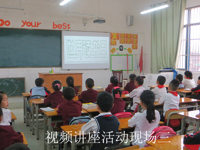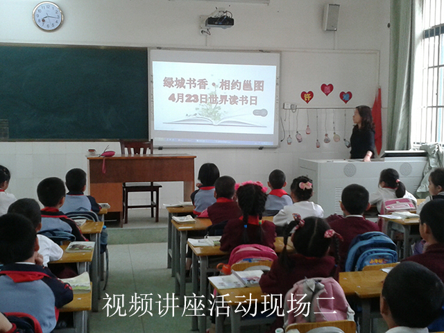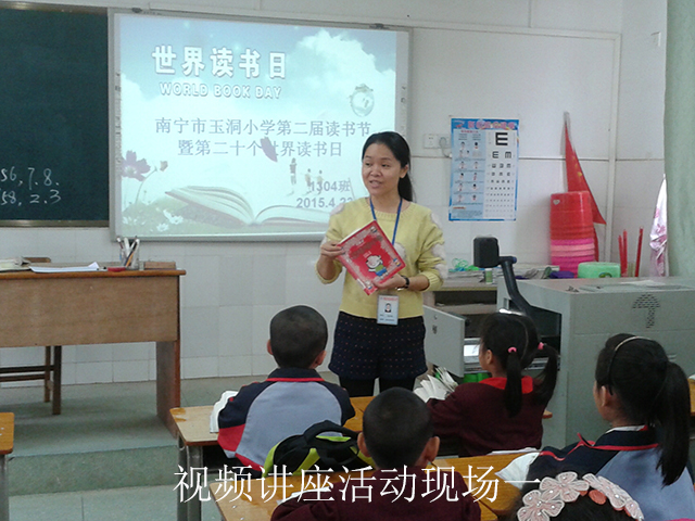 时值第20个“世界读书日”暨南宁市玉洞小学第二届读书节,该小学在全校范围内播放了由南宁市图书馆精心制作并倾情提供的“世界读书日”专题短片和中国作家协会会员、鲁迅文学院第六届全国儿童文学作家高级研讨班学员、广西区作协儿童创作文学委员会副主任、广西区作协第七、第八届签约作家、南宁市作协签约作家、玫瑰作家王勇英曾在南宁市图书馆主讲的“从生活走进故事”文学专题公益讲座视频。