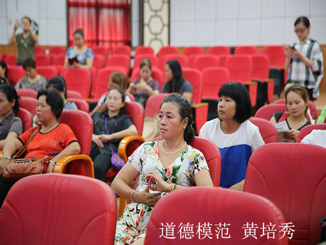 2015年5月7日下午,沙井街道党工委、南站社区在市图书馆举办的“道德讲堂”上,讲述人李响生动地为大家讲述了黄培秀“十年无私奉献 朴实无华感动众人”的故事。作为居民代表,黄培秀经常深入居民群众,了解群众的心声并反映到居委会;义不容辞地参与到创建文明城、卫生城、“花样南宁”等活动及社会公益事业中,拉上老伴主动清理社区内的垃圾和卫生死角、墙体广告,提醒、劝导其他居民按规定停车、不随手丢垃圾等。此外,她还是左邻右里的贴心人,真心实意地帮助困难群众,不仅主动把电话留给社区的独居老人,平时尽力给予帮助,碰上有特殊情况的家庭,她还奉献了无私的爱心。