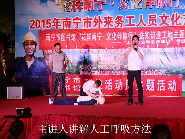 当天的活动也是南宁市图书馆科技活动周主题活动之一,不仅汽车图书馆开进了华南城工地,“绿城讲坛”还为广大外来务工朋友们邀请到了南宁市急救医疗中心培训科邓双昌副科长及刘媛干事带来“工地安全与急救知识”专题讲座。主讲人邓双昌结合案例为工友们分析了日常工作中工地常见的几种危害个人人身安全的事故,如触电、高空坠物、碰撞等,然后针对不同状况为工友们详细讲授了如何做有效的临时处理,以便争取宝贵时间,为医护人员的救护创造条件。在演示如何救治呼吸暂停、脉搏停止受伤人员时,刘媛干事还利用道具假人,讲解了人工呼吸、心脏按压复苏的正确手法,再通过邓双昌副科长的同步讲解,使工友们非常直观的学习了急救方法。理论还需结合实践,一位刘姓工友也上台在两位老师的指导下进行操作,通过这个方式,老师们又将几个重要事项进行了强调,加深大家的印象。邓双昌老师说:“在面对突发情况的时候,掌握急救知识就是在和时间赛跑,对于伤者来说,每一分每一秒都是格外的珍贵。”随后,主讲人还把止血、包扎伤口的方法和注意事项向大家进行了讲解。在现场,一位吕姓工友表示:施工安全很重要,更关键的是通过急救知识学习,让大家进一步提高安全意识,养成良好习惯,这才是规避危险,保护自己的最正确的办法。