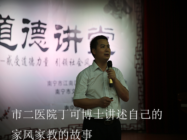 当天的道德讲堂围绕“弘扬美德正能量•身体力行传家风”主题,先后按照自我反省、唱歌典、学模范、诵经典、谈感悟、送吉祥六个流程进行。讲堂通过引古说今的形式,讲述中华传统良好家风家教历史典故和观看现代名人家风短片,引导参会人员进行了“开场三问”的自我反省环节;唱歌曲环节中,伴随音乐的响起,参会人员与领唱者一同唱响了《公民道德建设歌》;讲堂通过观看《丁可博士——最美家庭》视频短片的形式进入学模范环节,随着阵阵掌声的响起,第九届“南宁十大杰出青年”丁可博士上台用朴实无华的语言讲述了自己的家风家教的经历,真实感人的故事,让听众无不为之动容;接下来的诵经典环节,在讲堂主持人的引导下,全场参会人员齐声诵读了《社会主义核心价值观》基本内容;活动接近尾声,通过自我反省,以及观看和聆听了丁可博士良好的家风家教视频短片及故事,参会人员踊跃举手发言,畅谈自己的感悟。讲堂的最后,主持人与丁可博士一同为参会人员送上了本次道德讲堂的吉祥——“道德存折”,希望大家通过这小小吉祥记录下对文明与道德的点滴。