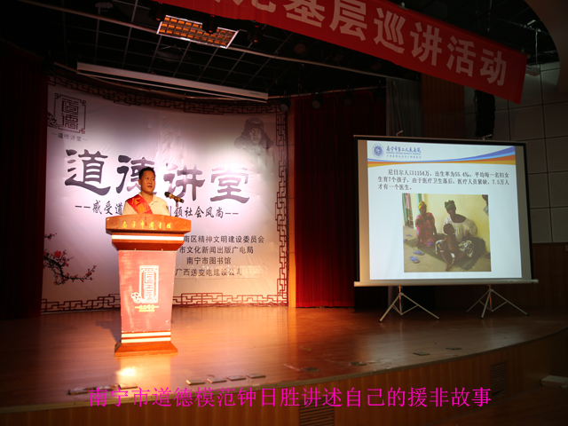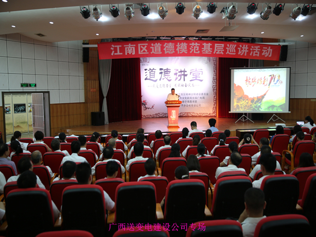 9日,为大力弘扬道德模范精神,南宁市图书馆、广西送变电建设公司携手江南区道德模范组成宣讲团举办主题为“爱岗敬业 无私奉献”道德讲堂。道德讲堂共有自我反省、唱歌曲、讲故事、诵经典、谈感悟、送吉祥等环节。当天活动也是江南区道德模范基层宣讲活动之一。