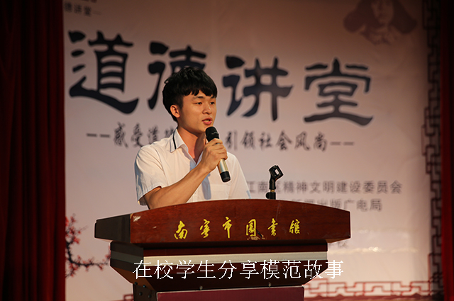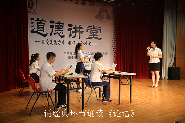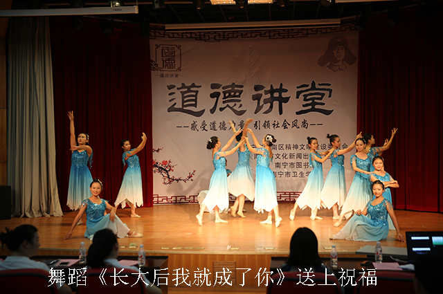 10月15日下午,南宁市卫生学校在南宁市图书馆举办的道德讲堂活动。本次道德讲堂以“三严三实”专题教育之“做人要实”精神为指导,以“修身立志 老实做人 谋事创业 示范践行”为主题,围绕学习莫振高先进典型展开。道德讲堂共分为六个环节:自我反省,唱歌曲,学模范,诵经典,谈感悟,送吉祥。活动以观看莫振高先进事迹的视频、都安高中毕业生讲述《我眼中的莫振高》开篇,让大家了解了莫振高校长的事迹。对照莫振高校长的先进事迹,师生代表讲述了学校老师的感人事迹。活动还通过经典诵读的形式,向师生讲述关于做人、做事、学习、从师的道理。在送吉祥中,同学们以一支舞蹈《长大后我就成了你》给老师送上祝福。节目的最后,在场的同学和老师都有感而发谈了自己的感悟。