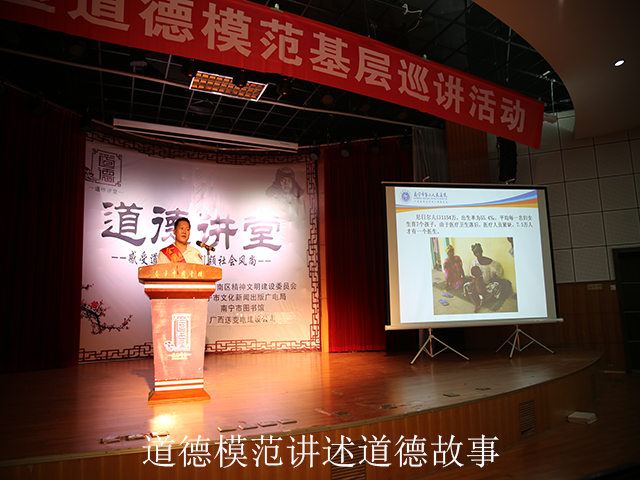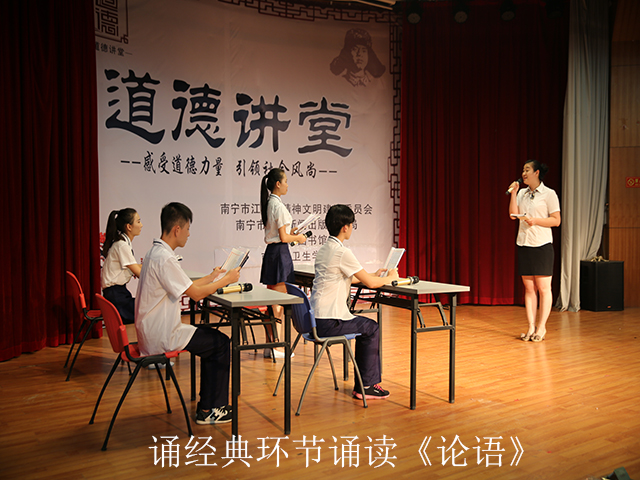 “道德讲堂”系列活动主要围绕“诚实守信、敬业奉献、助人为乐、见义勇为、孝老爱亲”等主题开展讲堂活动,重点突出孝道、诚信建设“美丽南宁•整洁畅通有序大行动”内容。做到了名称、背景、内容、标准、模式五个“统一”,整体布置风格一致,使用全市统一的背景模板和LOGO标识,主办单位同样落款清晰,参加活动的人员都肃整衣冠,会场桌椅也摆放有序,讲堂式的活动形式深受大家欢迎,无论从现场气氛还是从背景音乐,活动现场都极具庄重、肃穆、浓厚的国学氛围。