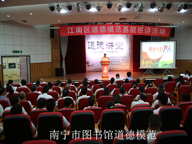 为真正把“道德讲堂”建设成为市民道德教育的主阵地,扎实推进“道德讲堂”的建设工作,南宁市图书馆牵手南宁市江南区精神文明建设委员会在该馆多功能厅设立“道德讲堂”总堂,定期开展道德教育主题活动。2015年全年共举办活动20场次,参加人数多达4千多人次,引起了较大的社会反响。