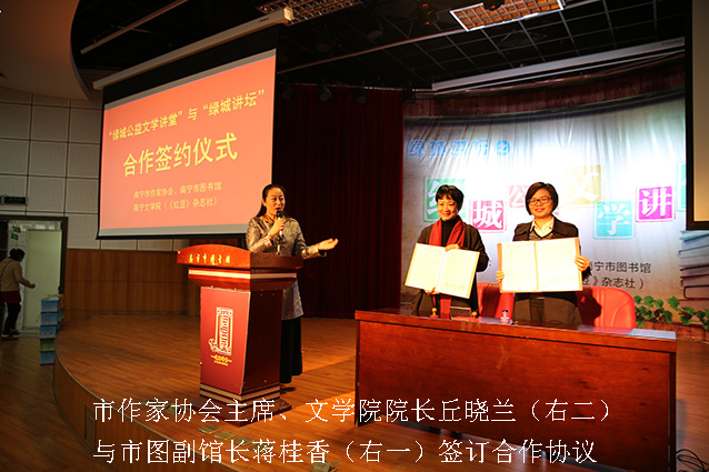 活动当天,南宁文学院院长、《红豆》杂志社长、主编、南宁市作协主席丘晓兰和南宁市图书馆副馆长蒋桂香在现场进行了神圣而庄严的签约仪式,南宁文学院副院长、《红豆》杂志副社长、南宁市作协副主席韦毓泉,南宁文学院副院长、《红豆》编辑部主任、南宁市作协秘书长侯建军和人民网、广西电视台、南国早报、南宁电视台、南宁日报、南宁晚报等新闻媒体的朋友们见证了这个造福绿城市民的颇有时代意义的时刻。