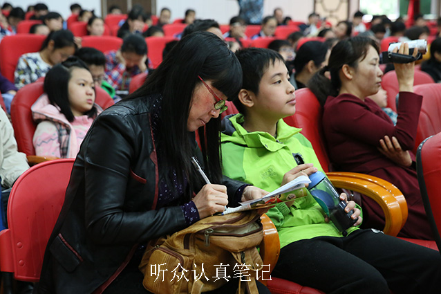 在“漫谈如何写好作文”讲座中,韦毓泉由自己所从事的编辑工作引出两个话题来精彩开讲:写作有什么魔力?给我们带来了什么?以及怎样才能写好作文?他以一位农村小青年为例,讲述了他因为能写而走进县里成了干部的经历,还为大家介绍了中国与世界上最著名的影响最大的文学大奖以及中国作家财富排行榜,以此激发大家提升写作欲望;韦毓泉还在讲座过程中进行了“丢蛋”测试,讲述了“严监生的两个手指头”的故事……他用生动的示范强调了写好作文必须拥有丰富的想象力这一重点,而关于特点方面他说,一定要仔细观察身边的一切,比如猫、老人等,用心写出真正与众不同的作文来。韦毓泉叮嘱大家,多读、多写才是写作成功的关键,他还悉心设计了一个读书记录表给大家参考。讲座还设有互动环节,不少聆听者积极提问交流,韦毓泉耐心作答,气氛轻松热闹。