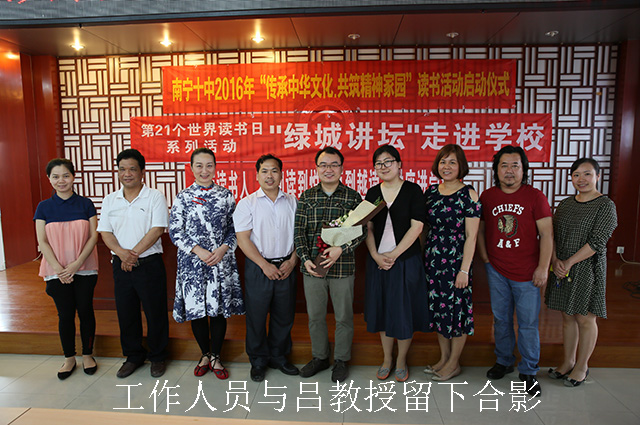 吕教授别开生面的讲座,让同学们意犹未尽。南宁十中副校长李军总结本场活动时用“书读百遍,其义自见”、“读书破万卷,下笔如有神”等名言鼓励学生们多读书,多泡图书馆,利用与十中相邻的南宁市图书馆这个有利条件,以书为友、与书相伴,让阅读成为日常生活必不可少的一部分。南宁十中党委书记陈珉也聆听了讲座。