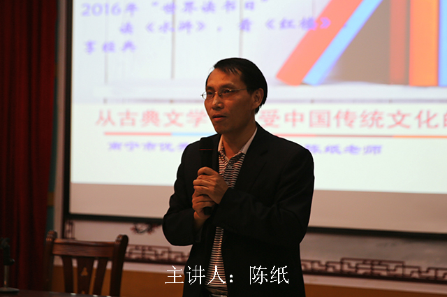 陈纸在一个多小时的讲座过程中无课件、无讲稿,全程或站或走动着与孩子们倾心交流,他称自己为“职业阅读者”。陈纸在现场问及有哪位同学通读过四大名著中的任何一本,场上亮出一只只高举的手臂令他倍感欣慰,南宁市图书馆为这些踊跃互动的孩子们送上了精美的木质书签和小笔记本作为奖励。与此同时,陈纸告诉孩子们,对于名著的阅读态度可以采取重读,因为不同年龄段对于同一本经典的阅读感受亦会有所不同,在渴望阅读的过程中养成一种耐力和韧性难能可贵,他说自己就把《复活》《包法利夫人》名著等阅读了四、五遍,每次都有新的收获。他巧妙地以场上孩子们对讲座主题的小声讨论所发出的窃窃私语声为例,问孩子们阅读经典时的心会是怎样的,然后确定:阅读经典的时候,无论周围环境怎样,在阅读者的角度却是完全寂静的,因为沉浸于书中的状态也正是经典的水平所在。何谓经典,由于时间的退后而能浮出水面的就是经典,能供人们很多年以后研究的、记忆的、学习的就是经典。在当今社会作为阅读者首先要警惕的就是铺天盖地的海量信息,当几份报纸刊登着几乎雷同的信息时,原创的作品少之又少,这些报纸的可读性也就大打折扣了。尤其是“低头族”的出现,人与人之间似乎已无暇顾及身边人的感受,而这些“快餐文化” 能在脑海留下印记的又都会是些什么?陈纸在剖析社会现象的同时,特别强调古典文学对于人类文明进步的重要意义,他说,古代汉语也许比较理论、比较抽象,但一旦探索入门,便会发现和感受到其中的奥妙,比如写作方面,古典文学在简洁的表述中蕴含着丰富的内容,其言外之意直令余韵无穷,就像绘画一般在减法中取胜,简约而不简单。