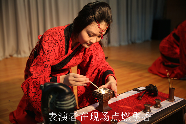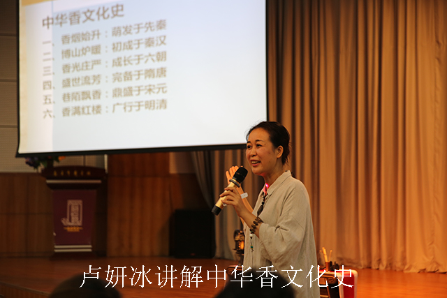 在讲座开始前,来自中哲文化工作室的两位表演者身着汉服、举止优雅地进行了香道表演,一时间暗香扑鼻,余韵缭绕,令人心旷神怡。香道是历史悠久的汉族传统艺术,通过眼观、手触、鼻嗅等品香形式对名贵香料进行全身心的鉴赏和感悟。在6000多年前的新石器时代,我们的祖先已寻觅芳香植物,燔木升烟,以告祭天地,称为“燎祭”。距今4000至5000年间,良渚文化中出现的陶熏炉说明了香炉作为祭祀礼器,也渗入日常生活。据卢妍冰介绍,中华香道萌发于先秦,初成于秦汉,成长于六朝,完备于隋唐,鼎盛于宋元,广行于明清。中国民间的香文化源远流长,如乞巧节缝制香囊展示女红、乞求灵巧的风俗,还有在端午节挂香袋、戴艾蒿的习俗仍流传至今。香,不仅芳香养鼻、颐养身心,还可祛秽疗疾、养神养生。而在现代忙碌喧闹的都市生活中,熏香还有助于提神醒脑、消除疲劳,平添一份闲情雅致。
