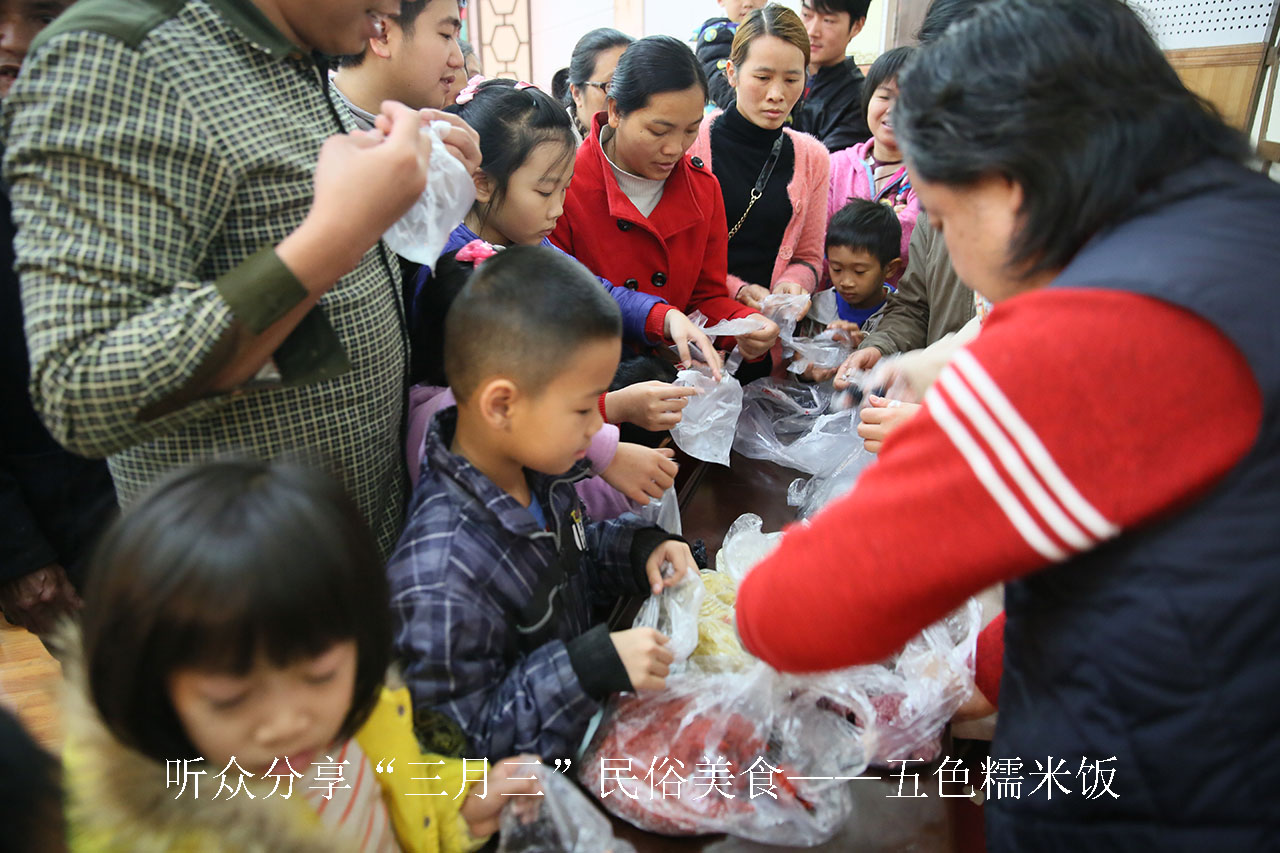 讲座最后,南宁市图书馆还特地为到场的每一位听众准备了五色糯米饭,读者活动部全维明主任和黄珂副主任将一份份饱含着吉祥寓意的五色糯米团分发给秩序井然的观众手上,让大家把这份五谷丰登的节日祝福带回家。