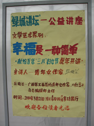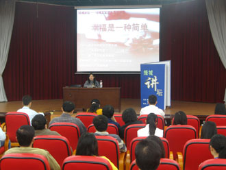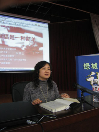 《幸福是一种简单》本身是一个很吸引人的书名,大家难免会对该书中的文章和作者对生活的感悟充满遐思。时值阳春三月花开的季节,南宁市文化局和南宁市图书馆为了给广大市民送上一份春天的礼物,于3月21日上午联合推出了“绿城讲坛”文化名人系列在虎年里的首场讲座——幸福是一种简单,南宁市图书馆读者书友会的书友以及来自社会各界的近两百位朋友聆听了讲座。