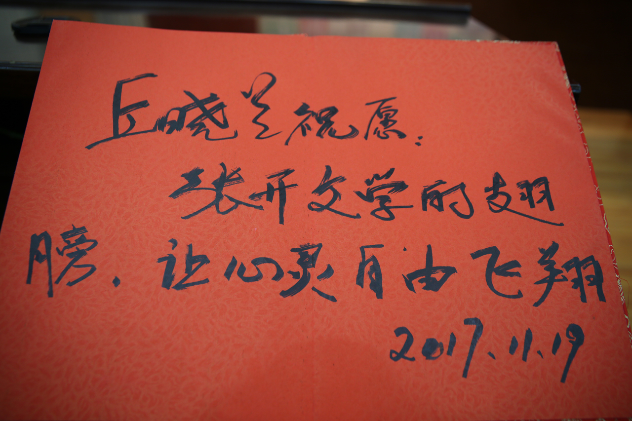 丘晓兰建议大家多阅读。“阅读就是读生活、读世道、读人心,经过阅读,我们有了开阔的视野和心胸,才能有审视世界与生活的尺度,才能分辨出生活中的真善美和假恶丑。只有阅读大量的书籍,才会让人读出责任、读出敬畏、读出感恩、读出这世界的大美,读出自己坚定、勇敢、自由的心。”最后,她祝愿大家张开文学的翅膀,让心灵自由飞翔!