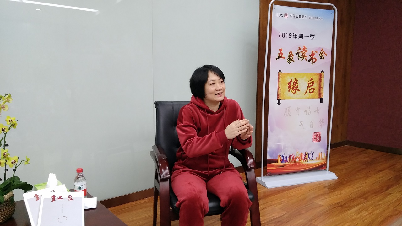 2019年3月13日,“绿城讲坛”进企业——走进五象读书会,这场以“缘启”为主题的读书会在中国工商银行股份有限公司南宁市五象支行正式启动。南宁市图书馆在此次活动中,邀请南宁市作家协会主席丘晓兰主讲,携手该支行青年员工积极参与其中,共享读书之乐。南宁市图书馆阅读推广人黄珂在现场也和大家分享了阅读和写作经验。