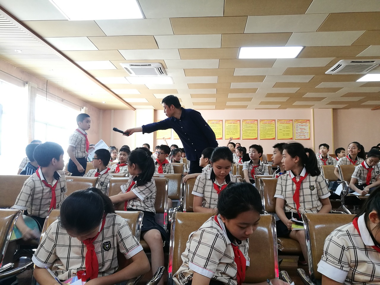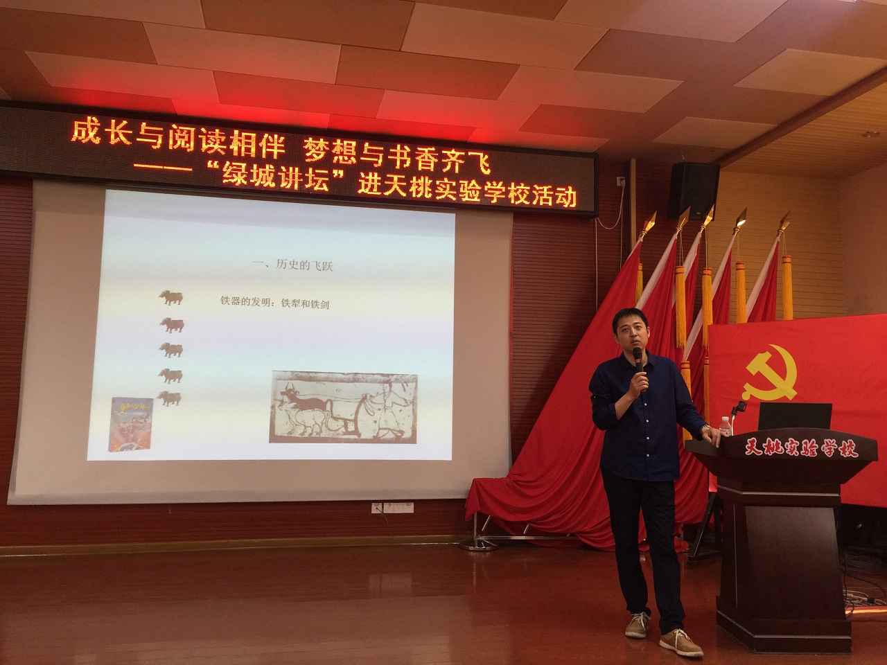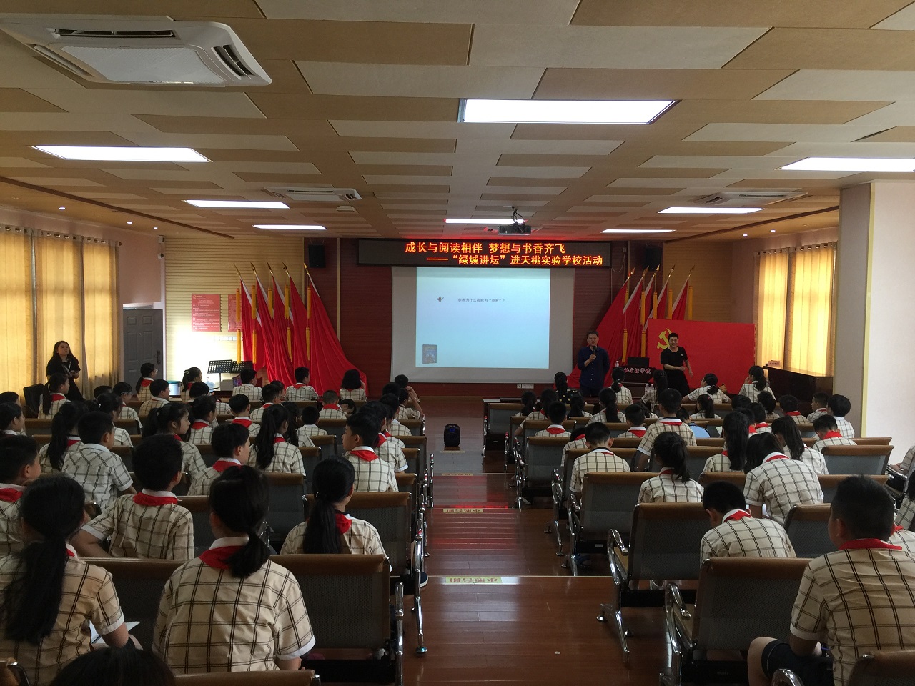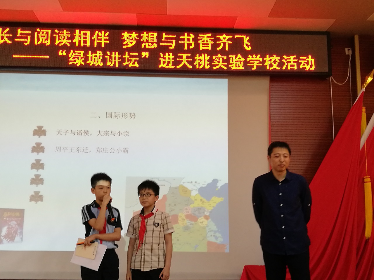 在中国历史的长河中有许多记录中华文明的瑰宝等待着人们的挖掘——司马迁说过:“有国者,不可以不知《春秋》”。了解中国历史,也能让中国后代更好的传承中华优秀文化,弘扬文化自信。国家未来靠少年,培养孩子们从小知仁义、懂廉耻、养正气、追圣贤,是一个国家未来强大的希望。为了让青少年了解博大精深的传统文化知识,做一代强国之少年,也为了献礼祖国七十华诞,在“4.23世界读书日”即将到来之际,4月22日下午,南宁市图书馆携手南宁市天桃实验学校(天桃校区)举办了“绿城讲坛”进校园系列活动之“走进春秋——春秋时期的历史成就与天下大势”阅读主题讲座活动。天桃实验学校的同学们在此活动中学习历史,展望未来,度过了一个丰富多彩的下午。