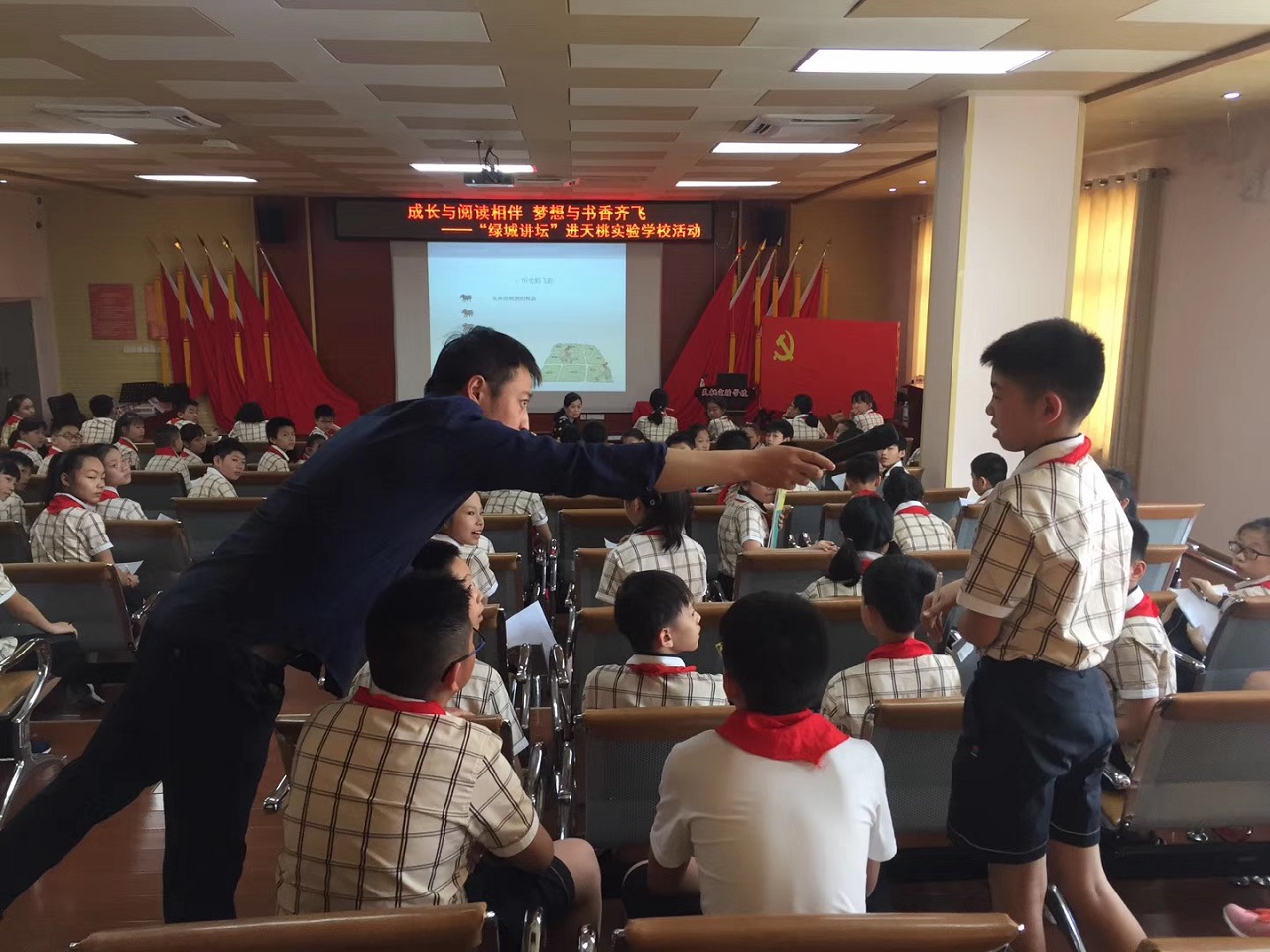 本次活动中,南宁市图书馆邀请到著名的诗人、小说家、编剧王磊老师为大家介绍春秋时期的国家历史知识。王磊老师从春秋时期的历史发明、当时的国际形势及小说里的春秋三个方面为天桃实验学校的同学们带来了一场别开生面的历史课。讲座现场互动多多,天桃实验学校的同学们储备了扎实的历史知识,对王磊老师的提问积极抢答,对答如流。抢答中有两位同学自告奋勇,讲述了周幽王烽火戏诸侯的故事,两人你一句我一句,把历史故事讲得绘声绘色,听得现场在座的同学们叹为观止,欲罢不能。
